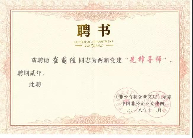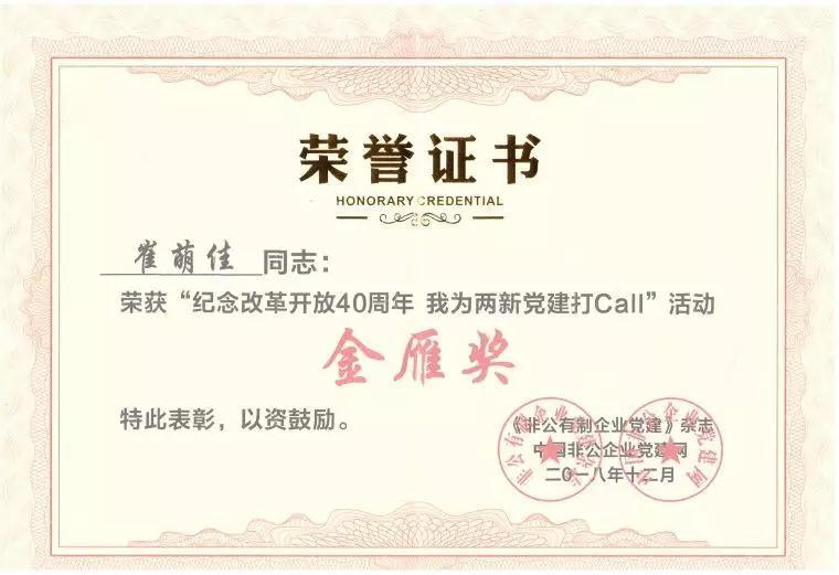 桂林萬禾農產品公司黨總支書記崔萌佳被現場授予全國優秀兩新組織黨組織書記“金雁獎”殊榮,并被《非公有制企業黨建》雜志、中國非公企業黨建網聘任為“先鋒導師”。據了解,全國共有40位兩新組織黨組織書記獲“金雁獎”榮譽。