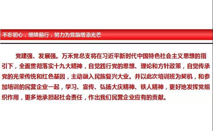 萬禾黨總支部作為桂林市兩新組織黨組織中的一員,在此次培訓班上的交流發言,是桂林市兩新組織黨建工作成果的重要體現,是黨建工作的亮點展示,對于今后做好兩新組織黨建工作起到了積極作用。下一步桂林市將堅持貫徹落實習近平新時代中國特色社會主義思想和黨的十九大精神,把兩新組織特色黨建工作延伸拓展到更多企業、行業和街區中,更好地發揮黨組織作用,打造獨具桂林特色的兩新組織黨建工作名片!