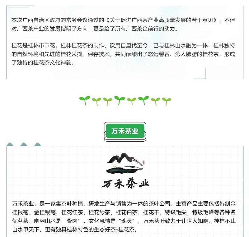 2019年12月5日,在廣西第二屆“桂林桂花茶”發展峰會上,廣西萬禾茶業的“萬禾幽香一號(特制金桂銀毫)”“萬禾幽香二號(金桂銀毫)”兩款桂花茶,榮獲桂林市第二屆“桂林桂花茶”茶王爭霸賽的一等獎和三等獎。