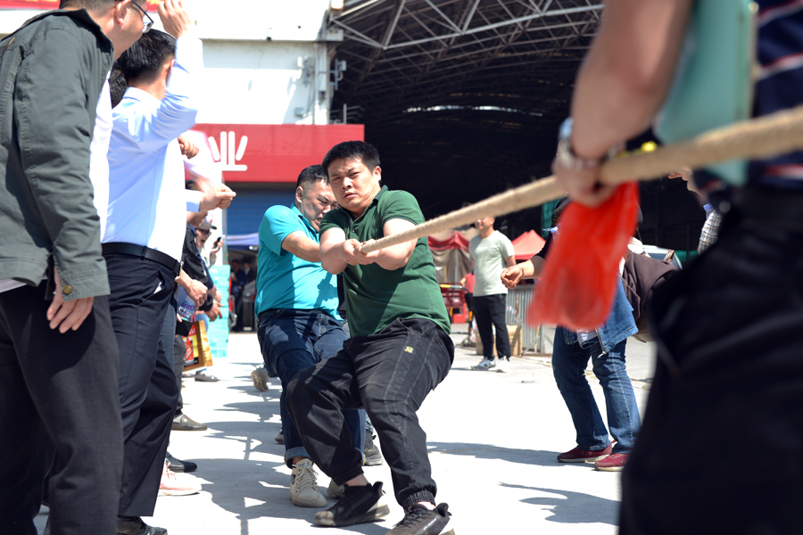 參賽隊員們排好隊列、擺正姿勢,雙手緊握繩子......隨著一聲哨響,一場拔河比賽緊張開鑼,大繩被拉得緊緊繃繃,各組隊員們全力以赴、咬牙堅持,“加油”的聲音響徹市場,一旁的啦啦隊亦是全情投入,感受著運動帶來的快樂。