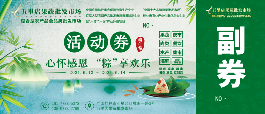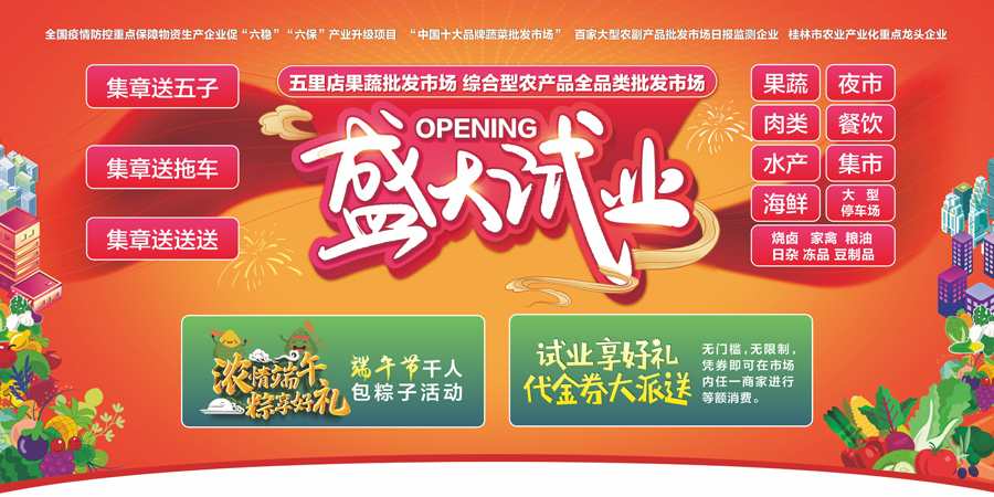 五里店果蔬批發(fā)市場(chǎng)——綜合型農(nóng)產(chǎn)品全品類批發(fā)市場(chǎng)期間試業(yè)歡迎廣大市民朋友前來(lái)市場(chǎng)消費(fèi),完成相應(yīng)集章數(shù)量,即可獲端午佳節(jié)五子好禮以及非常實(shí)用美觀的購(gòu)物拖車。