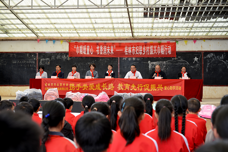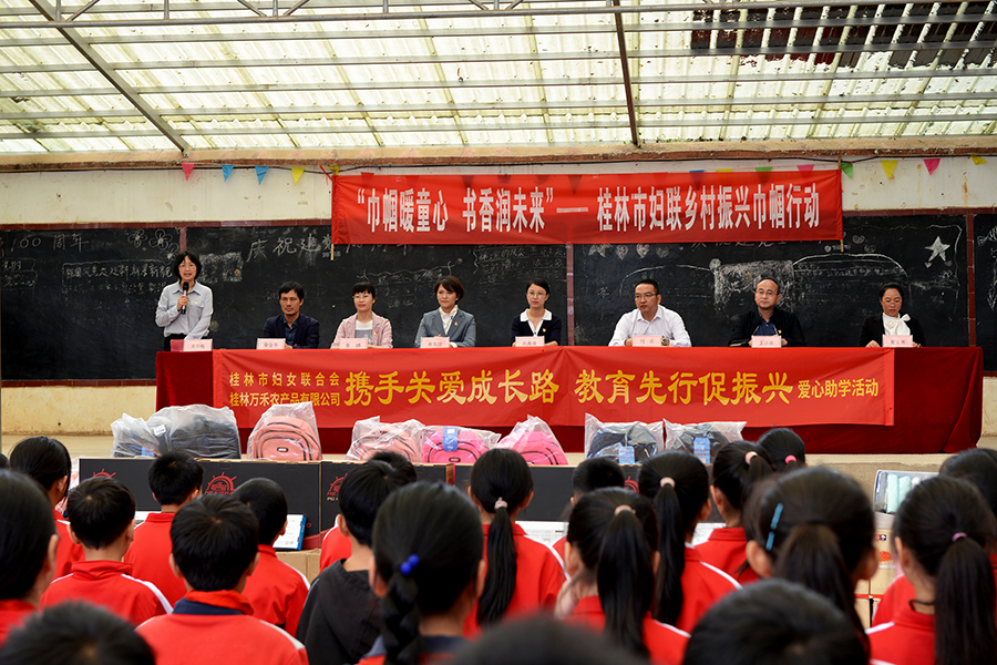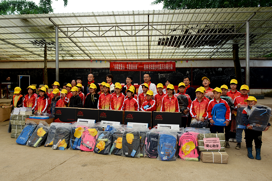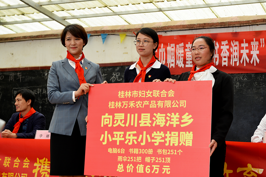 “攜手關(guān)愛成長路 教育先行促振興”愛心助學(xué)活動在靈川縣海洋鄉(xiāng)小平樂小學(xué)舉行。活動中,萬禾集團向小平樂小學(xué)捐贈教學(xué)電腦、書籍、書包、雨傘和帽子等物資,總價值6萬元人民幣。
