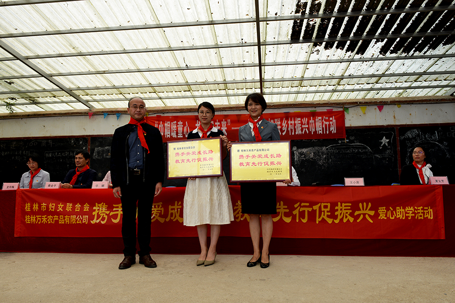 桂林市婦聯(lián)執(zhí)委常委、萬禾集團黨總支書記、總經(jīng)理崔萌佳作為愛心企業(yè)代表發(fā)言,她表示,為深入貫徹落實鄉(xiāng)村振興戰(zhàn)略,萬禾集團在企業(yè)發(fā)展過程中,一直與海洋鄉(xiāng)有著緊密的聯(lián)系,萬禾的發(fā)展之路更得益于鄉(xiāng)村振興戰(zhàn)略的實施,從單一的農(nóng)產(chǎn)品銷售平臺成長為農(nóng)業(yè)及農(nóng)產(chǎn)品流通產(chǎn)業(yè)發(fā)展的公司,對助力鄉(xiāng)村振興更有著義不容辭的責(zé)任。萬禾集團將以“促進振興鄉(xiāng)村教育和教育振興鄉(xiāng)村的良性循環(huán)”為紐帶,持續(xù)關(guān)注著海洋鄉(xiāng)各村屯產(chǎn)業(yè)興旺發(fā)展、生態(tài)文明建設(shè)、農(nóng)民生產(chǎn)生活狀況。