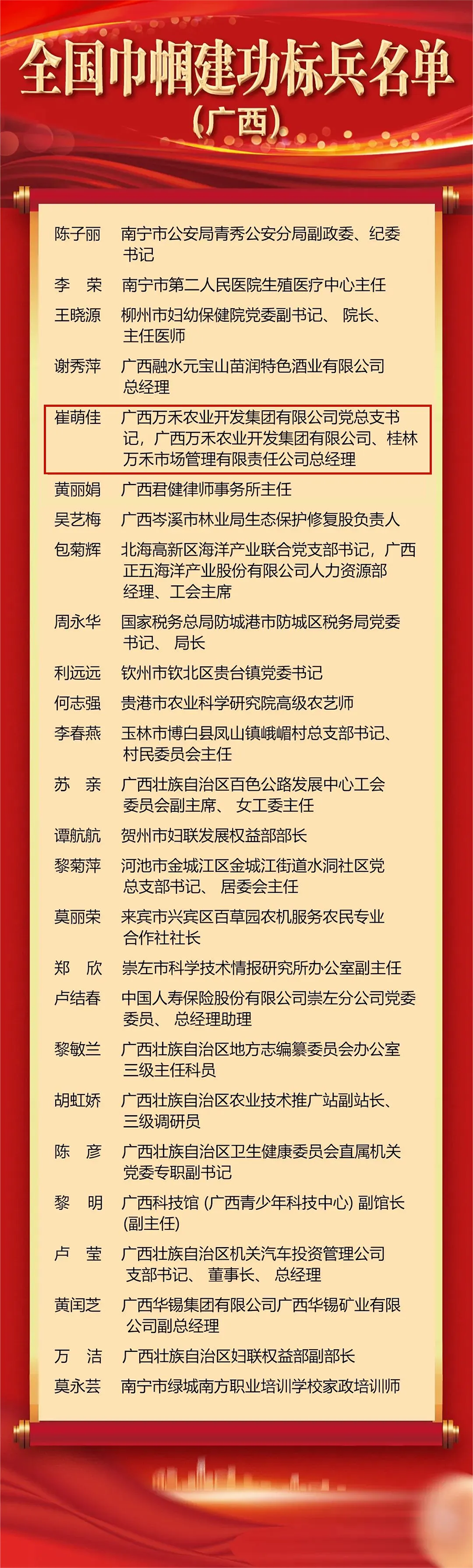 2月25日,全國(guó)婦聯(lián)印發(fā)《關(guān)于表彰全國(guó)三八紅旗手標(biāo)兵、全國(guó)三八紅旗手、全國(guó)三八紅旗集體和全國(guó)巾幗文明崗、全國(guó)巾幗建功標(biāo)兵、全國(guó)巾幗建功先進(jìn)集體的決定》,廣西萬(wàn)禾農(nóng)業(yè)開發(fā)集團(tuán)有限公司黨總支書記,廣西萬(wàn)禾農(nóng)業(yè)開發(fā)集團(tuán)有限公司、 桂林萬(wàn)禾市場(chǎng)管理有限責(zé)任公司總經(jīng)理崔萌佳獲授“全國(guó)巾幗建功標(biāo)兵”稱號(hào)。