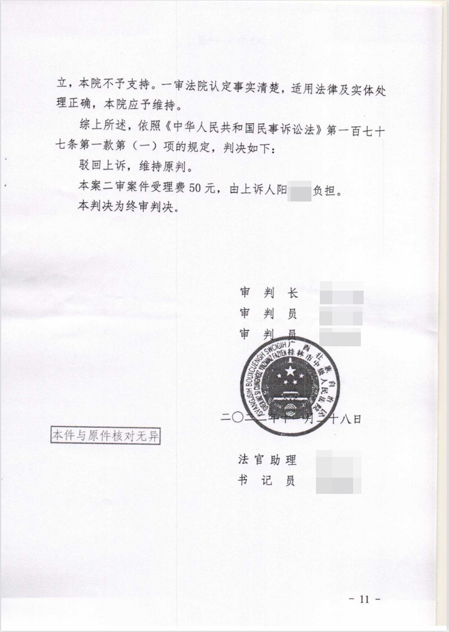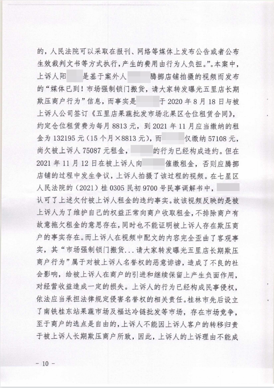 2022年11月28日,桂林萬禾市場管理有限責任公司(以下簡稱:萬禾市場公司)與陽某某名譽權糾紛案件作出二審判決,駁回陽某某上訴,維持一審原判,陽某某向萬禾市場公司賠償損失、賠禮道歉,以消除影響,恢復名譽。