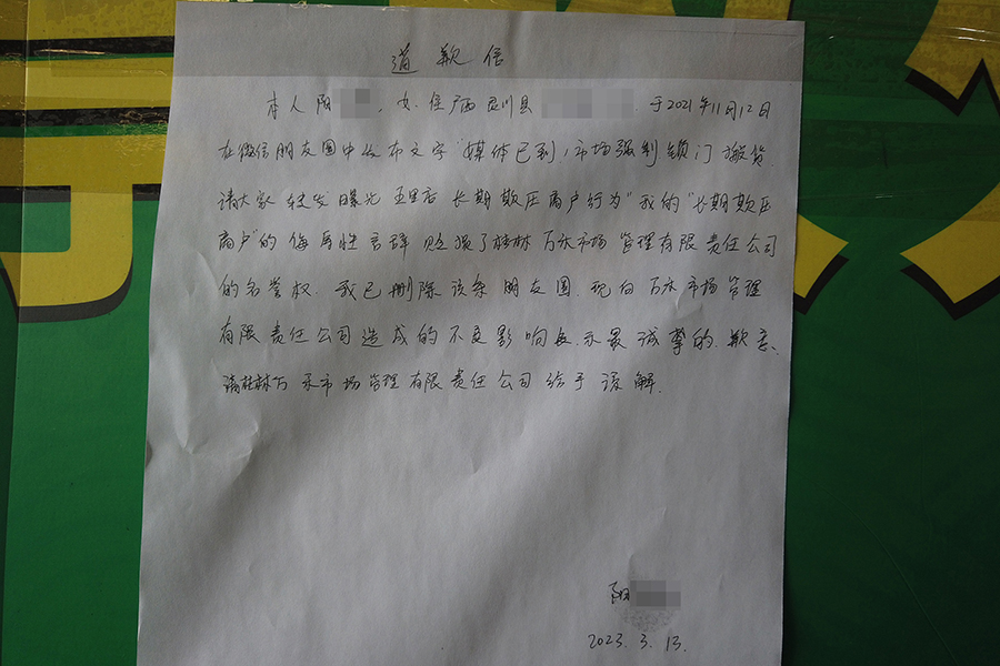 本人陽某某,女,住廣西靈川縣,于2021年11月12日在微信朋友圈中發布文字“媒體已到!市場強制鎖門搬貨,請大家轉發曝光五里店長期欺壓商戶行為”我的“長期欺壓商戶”的侮辱性言辭貶損了桂林萬禾市場管理有限責任公司的名譽權,我已刪除該條朋友圈,現向萬禾市場管理有限責任公司造成的不良影響表示最誠摯的歉意,請桂林萬禾市場管理有限責任公司給予諒解。